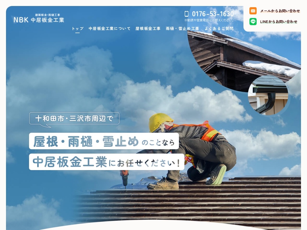 中居板金工業は、青森県三沢市に拠点を置き、十和田市を含む青森県内で長年にわたり屋根工事を手がけてきた実績があります。地域の気候特性を熟知した技術と、丁寧な施工で多くのお客様から信頼をいただいています。